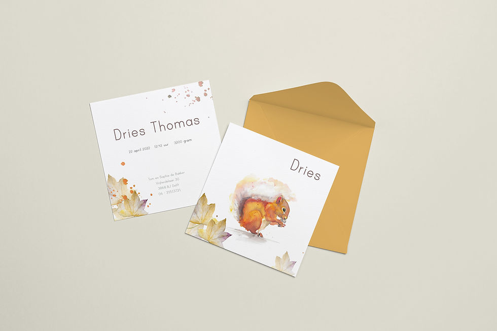 Een geboortekaartje voor herfstkindjes. Warme kleuren, een eekhoorntje, herfstbladeren (naar keuze